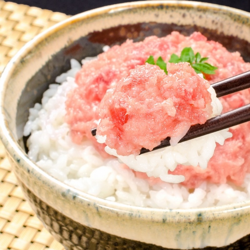 まぐろ本来の食感・旨みが残る、粗びき・粗みじん仕上げ。人の手で作った、上質な「まぐろのたたき」と同じような食感を目指しました。本まぐろの濃厚な旨味とメバチまぐろの赤身のさっぱりとした旨みを絶妙に配合!本格的なネギトロを求める、まぐろ通の方にもご満足頂けると思います。シンプルながらも絶妙な粒感のバランスをお楽しみ下さい。高級感もあり、ネギトロ丼にした際も満足感が違います。