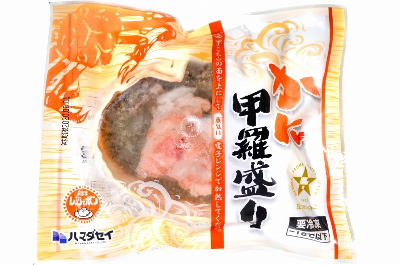 かにみそ甲羅盛り:紅ずわいがに(兵庫県香住港)、食塩、澱粉、蛋白加水分解物/カゼインNa、調味料(アミノ酸等)、(原材料の一部にかに・乳・小麦・大豆を含む)