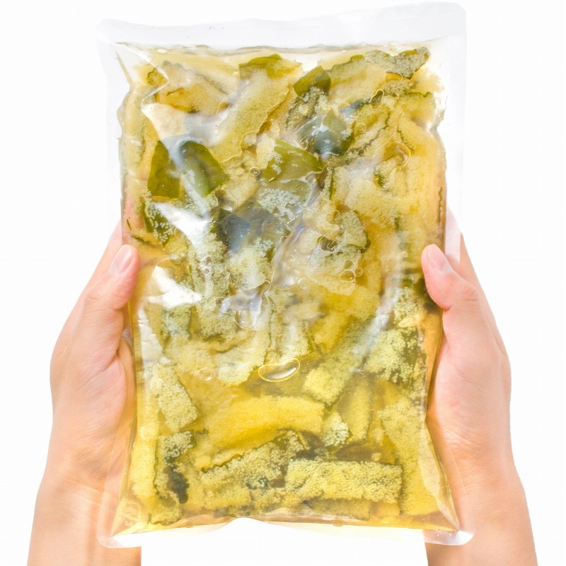■昆布に自然産卵させて作る天然の製法。ニシンは産卵期には沿岸に押し寄せて産卵を行います。その時、湾にニシンを生簀に追い込んで、そこに昆布をたらして二シンの卵を付着させます。昆布と付着したニシンの卵を塩漬けにしたものが子持ち昆布です。「昆布」は喜ぶ(よろこぶ)という言葉から、「数の子」は粒の多さから子孫繁栄を連想されますので、家族の繁栄の意味から縁起の良い食べ物として重宝されてきました。今でも正月料理には、昆布や数の子が欠かせません。「昆布」と「数の子」が合わさった「子持ち昆布」は、美味しいだけではなく、本当に縁起の良い食べ物です。■子持ち昆布のお召し上がり方。味付けで塩抜き不要!解凍後そのまま、お召し上がり頂けます。食べ易くお好みのサイズにカットして頂いて、かつお削りぶしをトッピングしても美味しいです。最近は歯ごたえがパリパリの子持ち昆布の特徴を生かし、天ぷらや串カツの定番メニューとしても大変人気があります。